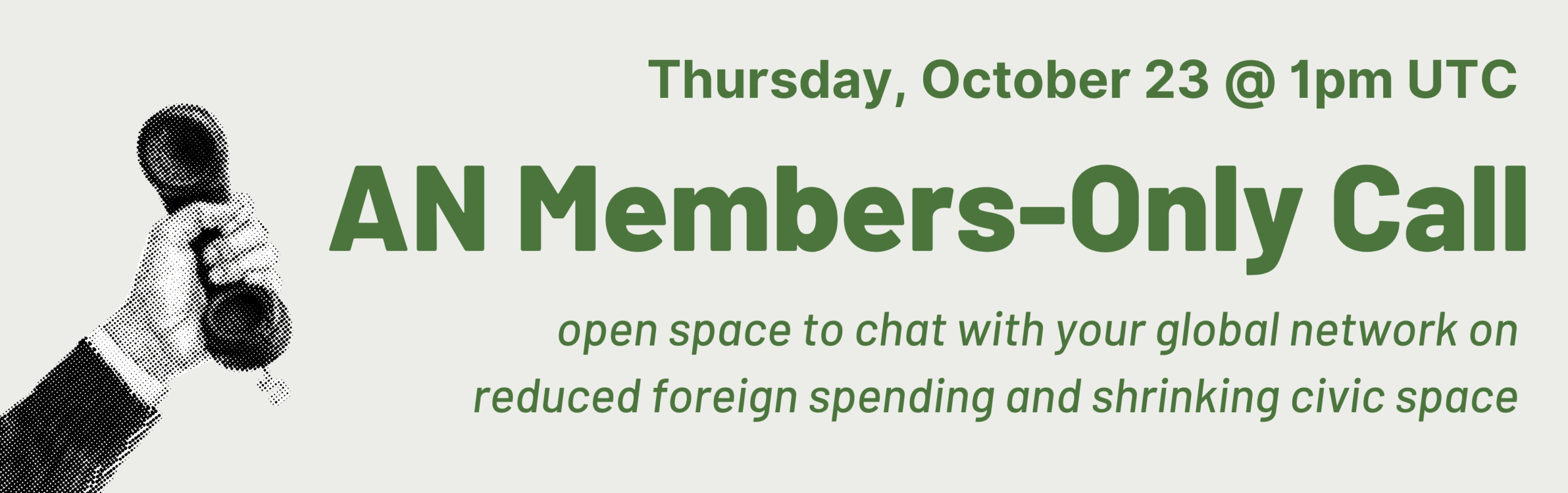 Our next Members-Only Call: Reduced Foreign Spending is on Thursday, October 23 at 1pm UTC. Join your fellow AN Members for an open space to chat about reduce foreign spending, shrinking civic space, and recent and real impacts.