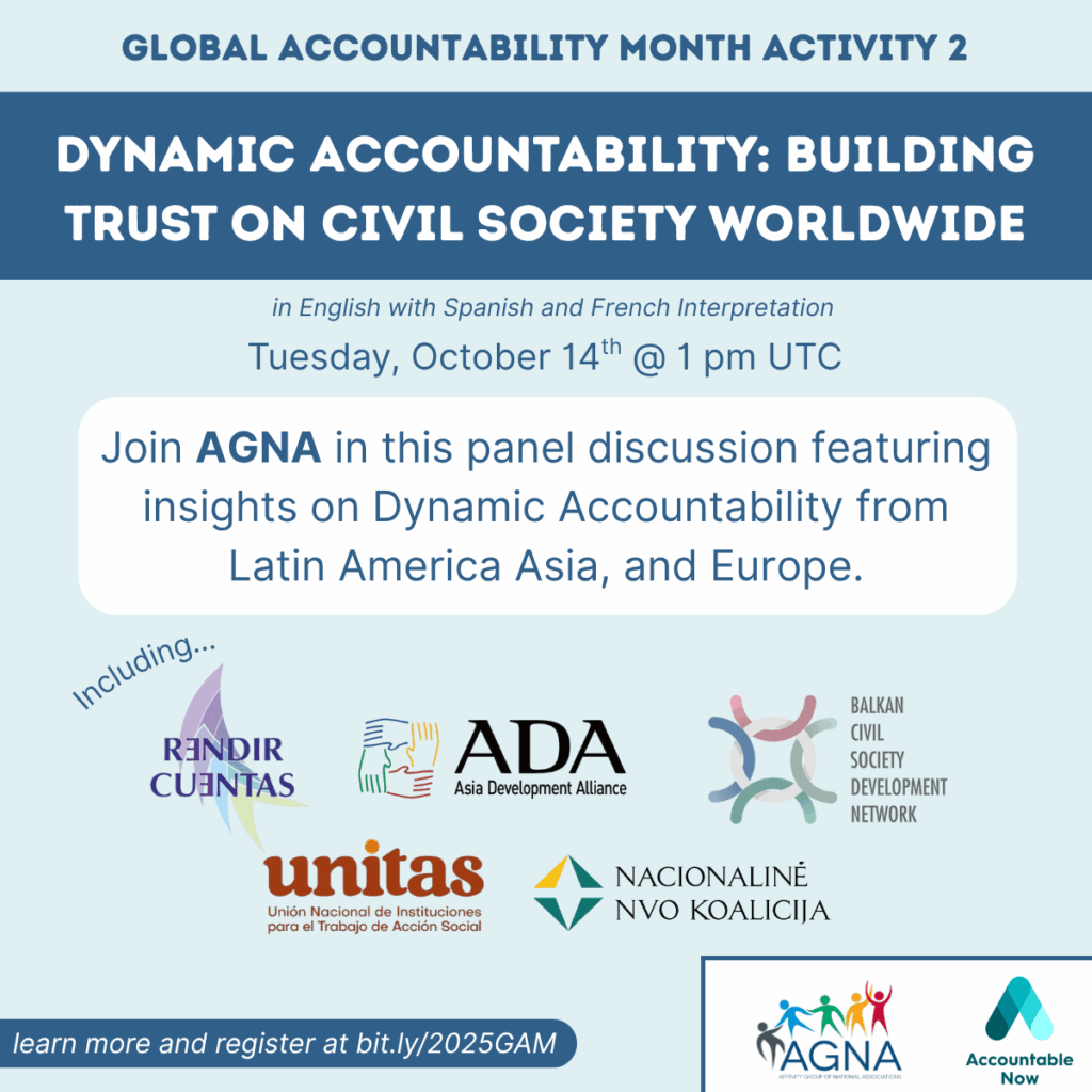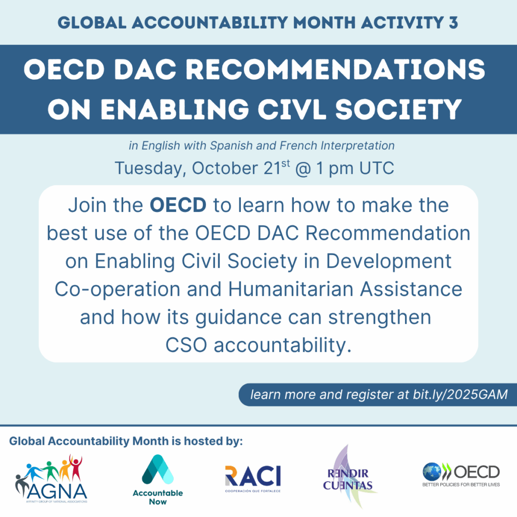 Cohosted by AGNA (CIVICUS: World Alliance for Citizen Participation), Accountable Now, RACI, Iniciativa Regional Rendir Cuentas, and OECD – OCDE, this Global Accountability Month is filled with events and resource sharing.