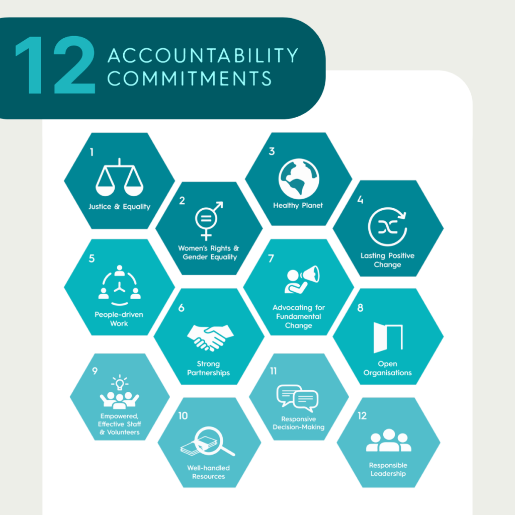 In the early days, our reporting relied on an existing framework called the General Reporting Initiative for accountability quality assurance, but we soon recognized an underlying need to co-create a set of unified commitments for civil society, by civil society. Starting in 2013, we began collaborating with other prominent civil society sister networks to design a set of commitments that unify what accountability looks like for civil society organizations, as individuals and as a collective. This collaboration led to the creation and launch of the Global Standard for CSO Accountability, an initiative that followed a bottom-up approach to co-creation, largely led by Majority World organizations and networks. Through this co-creation process, the 12 Commitments was developed, reflecting a shared vision of what accountability and responsibility mean for CSOs worldwide. The commitments represent a shift towards accountability as both downwards and outwards, rather than only upwards to donors and governments.